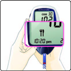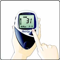 - Periksa kode strip dan tanggal kadaluarsa. Pastikan kode pada alat sama dengan kode strip yang akan digunakan. Jika kode strip dan alat berbeda, gantilah kode pada alat. Tekan tombol daya pada alat selama 2 detik. Saat muncul nomor kode berkedip pada layar, lepaskan tombol daya. Gantilah kode dengan menekan tombol (+) dan (-) pada bagian samping alat. Saat kode sudah sesuai, simpan kode baru dengan menekan dan melepas tombol daya.
