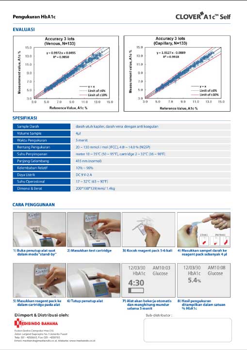 Clover A1c mengukur Hemoglobin A1c yang dapat menunjukkan rata-rata kadar gula darah dalam 3 bulan. Clover A1c membantu pasien untuk mengontrol diabetes dan dapat digunakan untuk laboratorium, klinik, dan rumah sakit. Alat ini unggul dengan adanya USB Port sehingga data dapat diunduh dengan mudah dan jumlah memori tes hingga 200 tes tiap kemasan. Seperti alat diagnostik lain, hasil tes tunggal tidak dapat digunakan sebagai definitive diagnosis, tenaga medis harus melakukan diagnosis berdasarkan keseluruhan uji klinis.