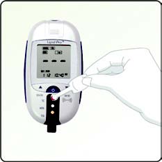 - Tempelkan rod kapiler ke lubang TC (Total Cholesterol) dengan sedikit menekan, hingga bunyi “bip”. Artinya, sampel sudah cukup. Jika tidak, hasil yang muncul bisa tidak akurat.