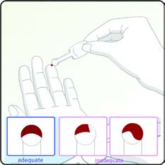 - Ambil sampel darah lagi dengan menggunakan rod kapiler yang baru. Sampel harus memenuhi cekungan setengah lingkaran (sesuai gambar yang dilingkari).