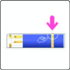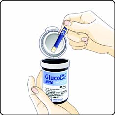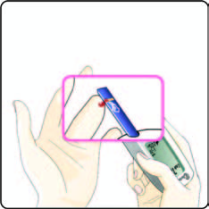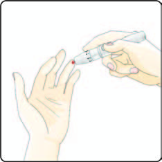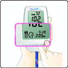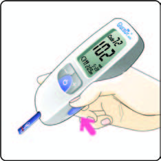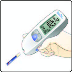 - Ambil sampel darah dan dekatkan strip sesuai arah panah.