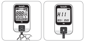- Masukkan strip tes sampai suara “bip” & periksa nomor kode pada botol strip tes.