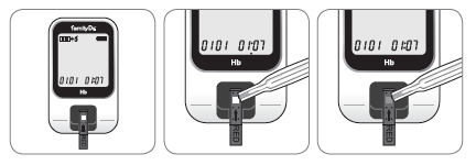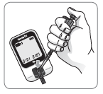 - Setelah mendapatkan sampel darah yang cukup, posisikan ujung pipet ke lubang pada strip . Tekan tombol untuk memindahkan darah ke strip.