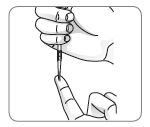 - Kumpulkan sampel darah menggunakan tabung transfer darah/mini pipet (7μL). Tekan lembut tabung transfer darah untuk memasukkan darah pada strip tes sehingga darah terserap ke dalam strip tes dan tunggu hasil dalam 5 detik.